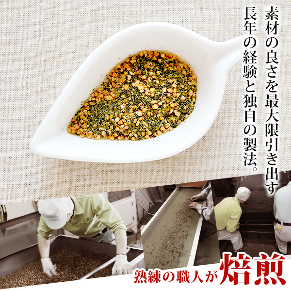 国産玄米をじっくりと香ばしく焙煎し、岡山県美作の一番茶(新茶)をブレンド。 香ばしい香りとまろやかな味わいで、毎日飲んでも飲み飽きない人気の健康茶です。