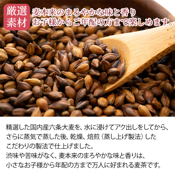 精選した国内産六条大麦を、水に浸けてアク出しをしてから、さらに蒸気で蒸した後、乾燥、焙煎(蒸し上げ製法)したこだわりの製法で仕上げました。 渋味や苦味がなく、麦本来のまろやかな味と香りは、小さなお子様から年配の方まで万人に好まれる麦茶です。