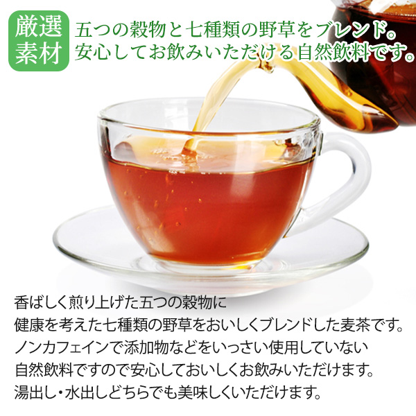| 原材料 | 大麦、トウモロコシ、はぶ茶、米、はと麦、チコリ、黒大豆、ルイボス、どくだみ、熊笹、ギムネマシルベスタ、ごぼう(日本、インド、アメリカ、他) |