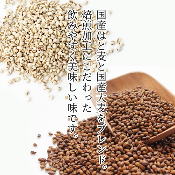 国内産大麦を遠赤焙煎加工し、アルファ化加工(蒸し加工)のあと焙煎加工したはと麦を配合。国内産原料と加工製法にこだわったブレンド麦茶です。